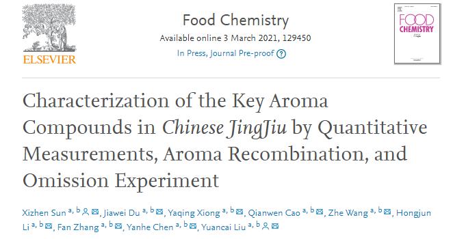 近日,國際學(xué)術(shù)期刊食品化學(xué)(Food chemistry,中科院1區,影響因子為6.306)在線(xiàn)發(fā)表了《通過(guò)定量分析,香氣重組和缺失實(shí)驗表征中國勁酒中的關(guān)鍵香氣活性化合物》的研究文章。撰稿人正是來(lái)自勁牌研究院的風(fēng)味研究小組。