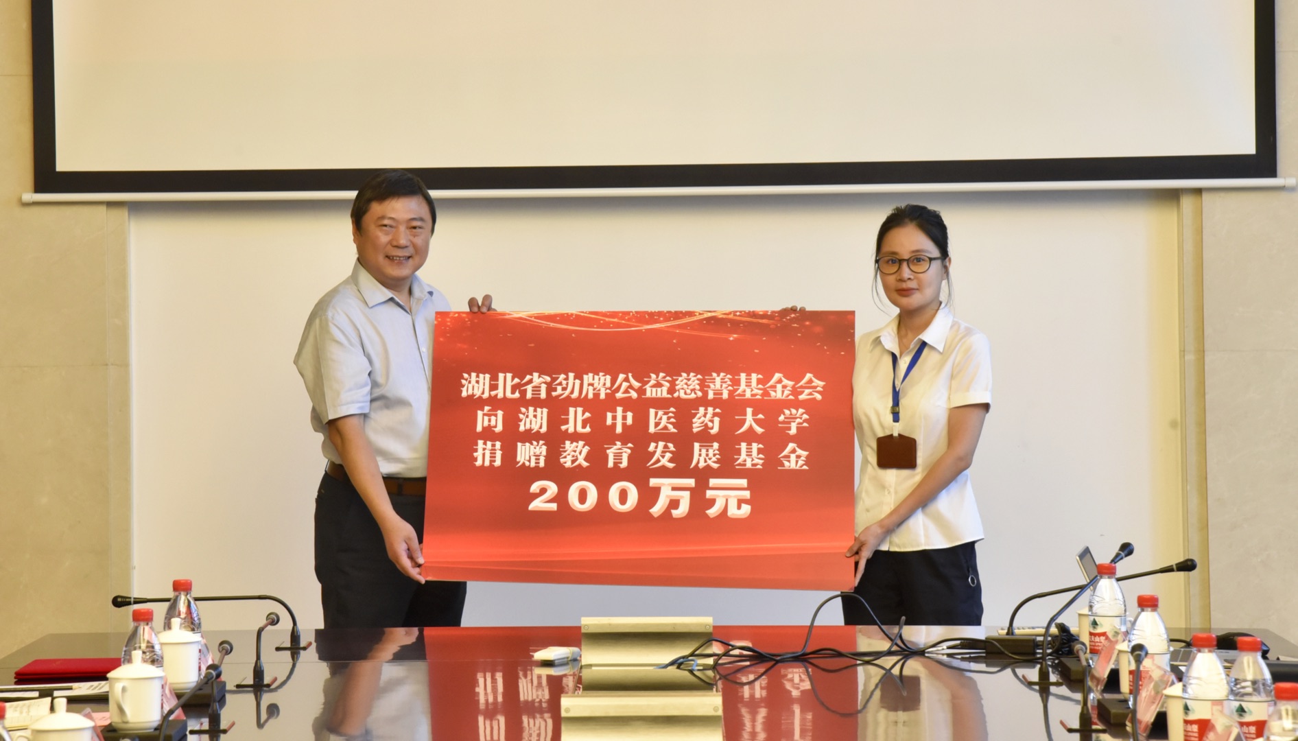 勁牌公益慈善基金會(huì )副理事長(cháng)吳曉敏授予湖北中醫藥大學(xué)辦公室主任汪海洋捐贈牌。